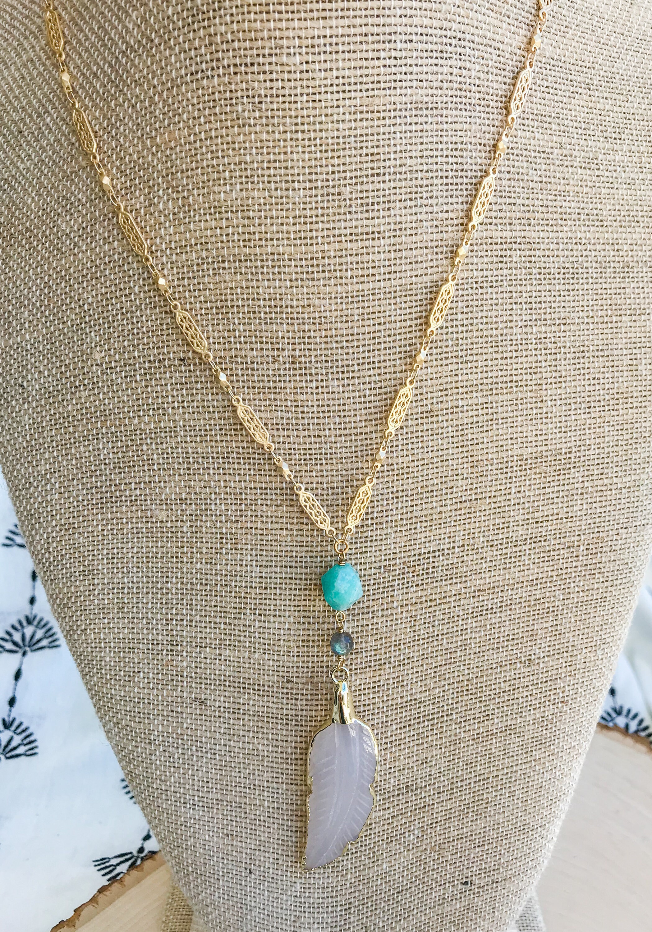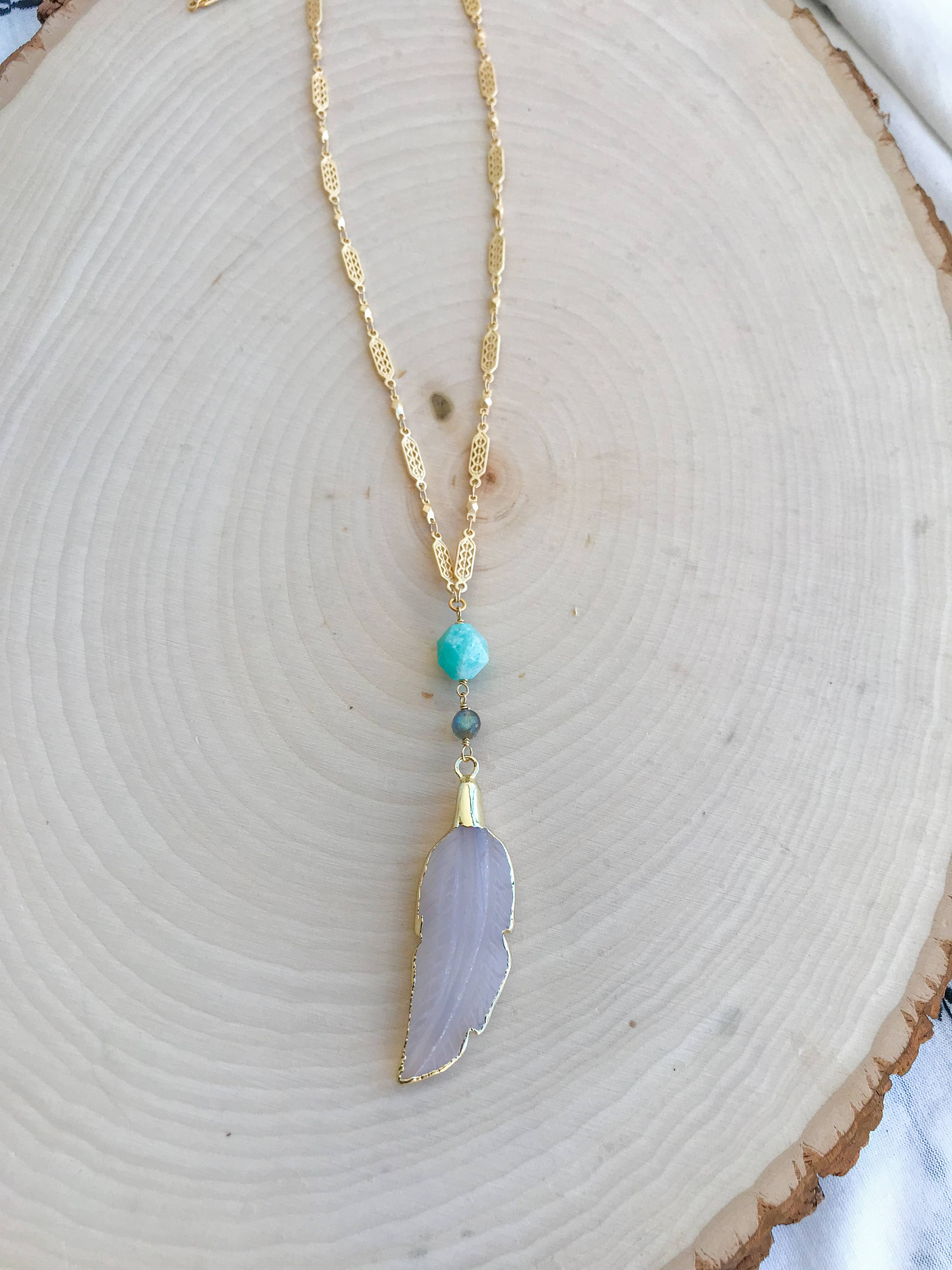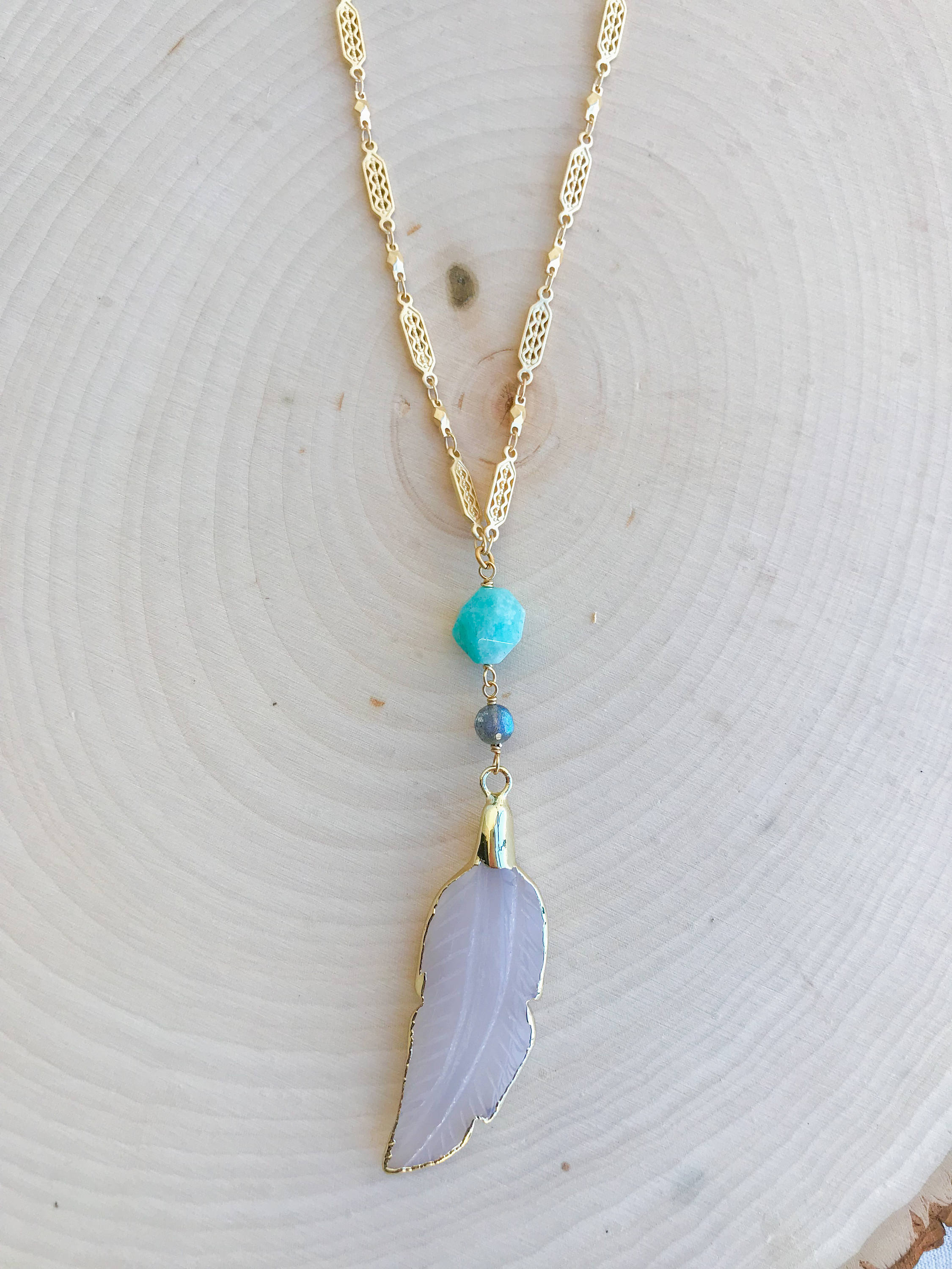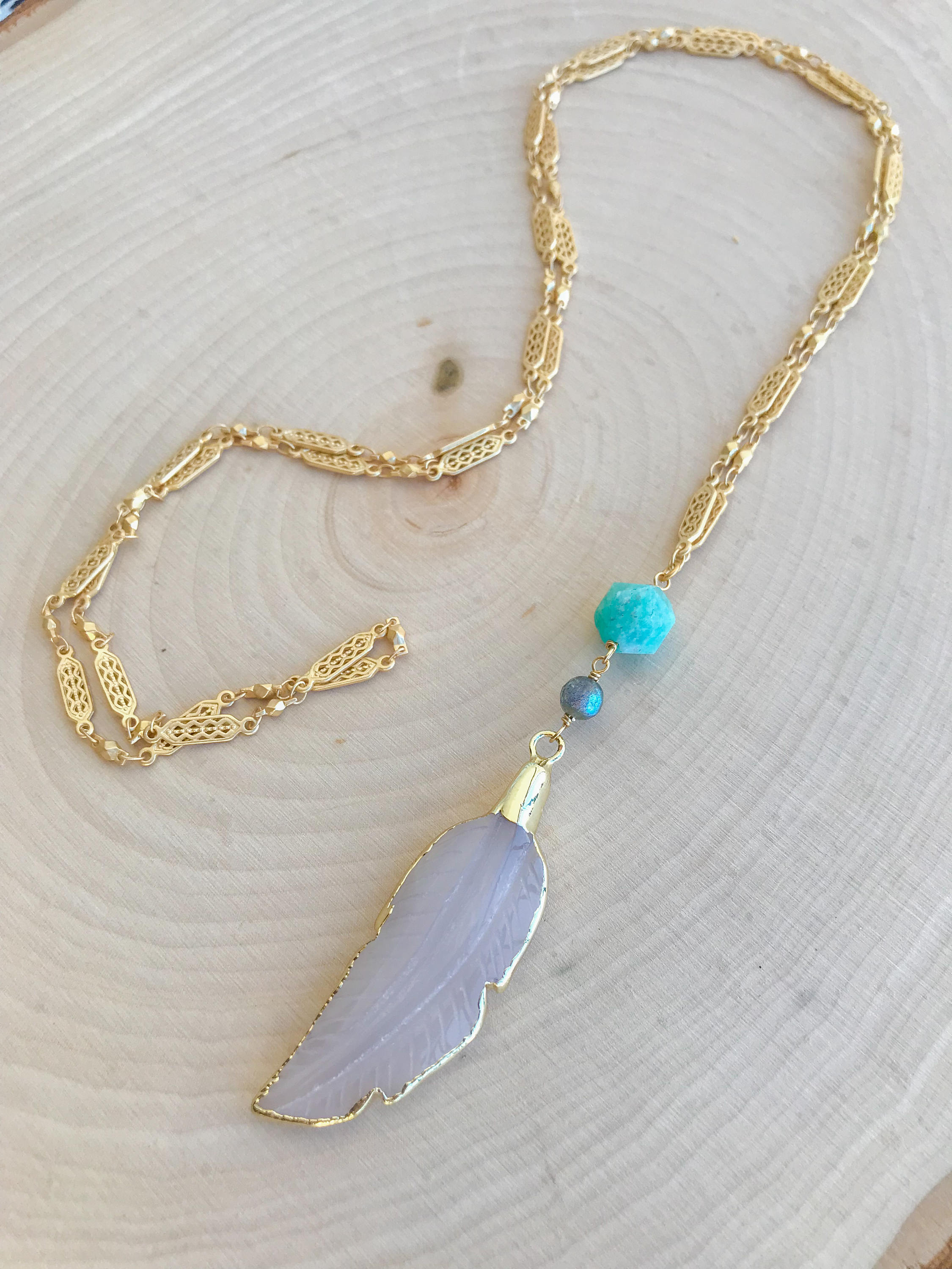 Carved agate feather pendant with Amazonite and Labradorite accents on detailed gold plated chain. 34" long.