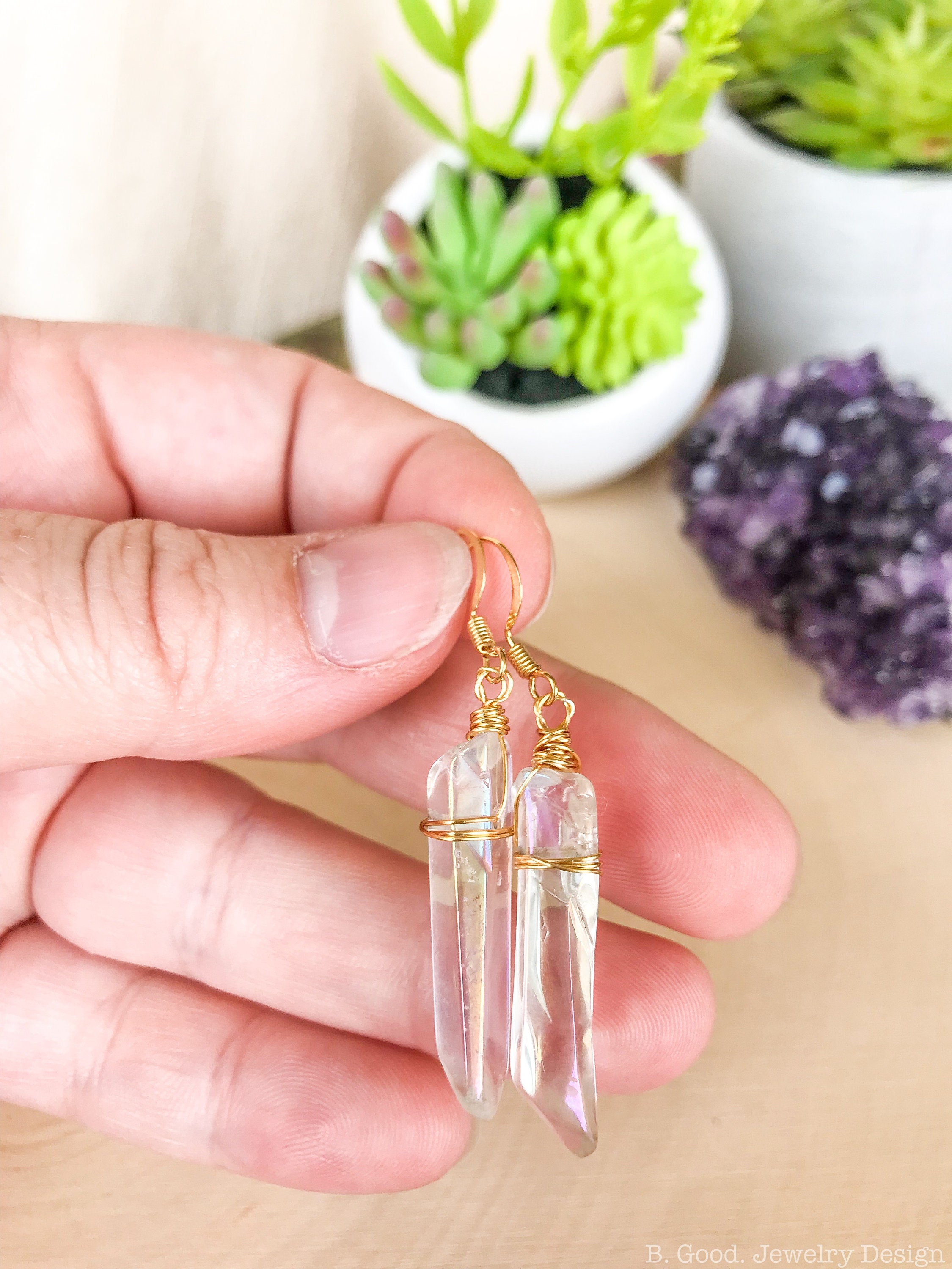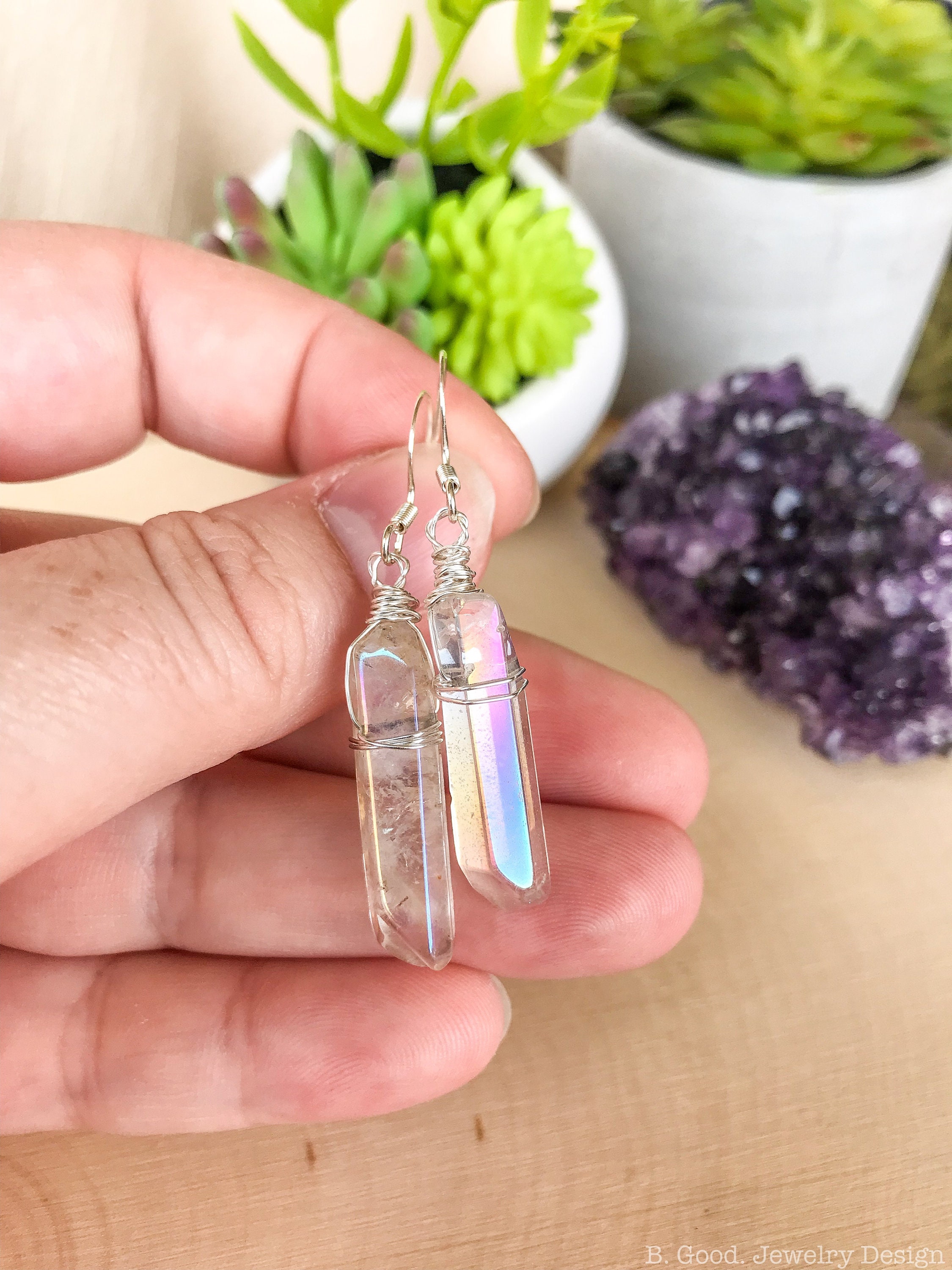 Wire wrapped aura quartz crystals on gold or silver plated nickel-free ear wires. 1.5" long.