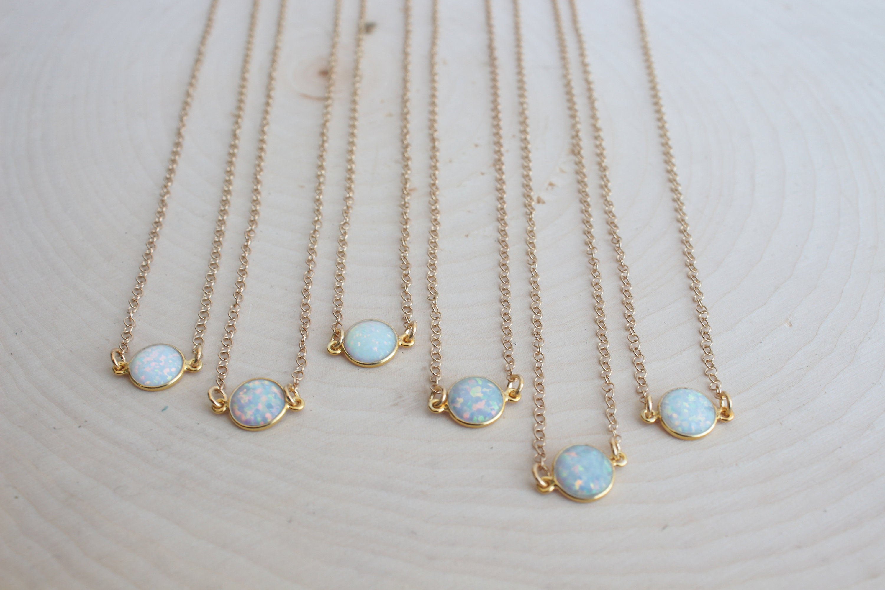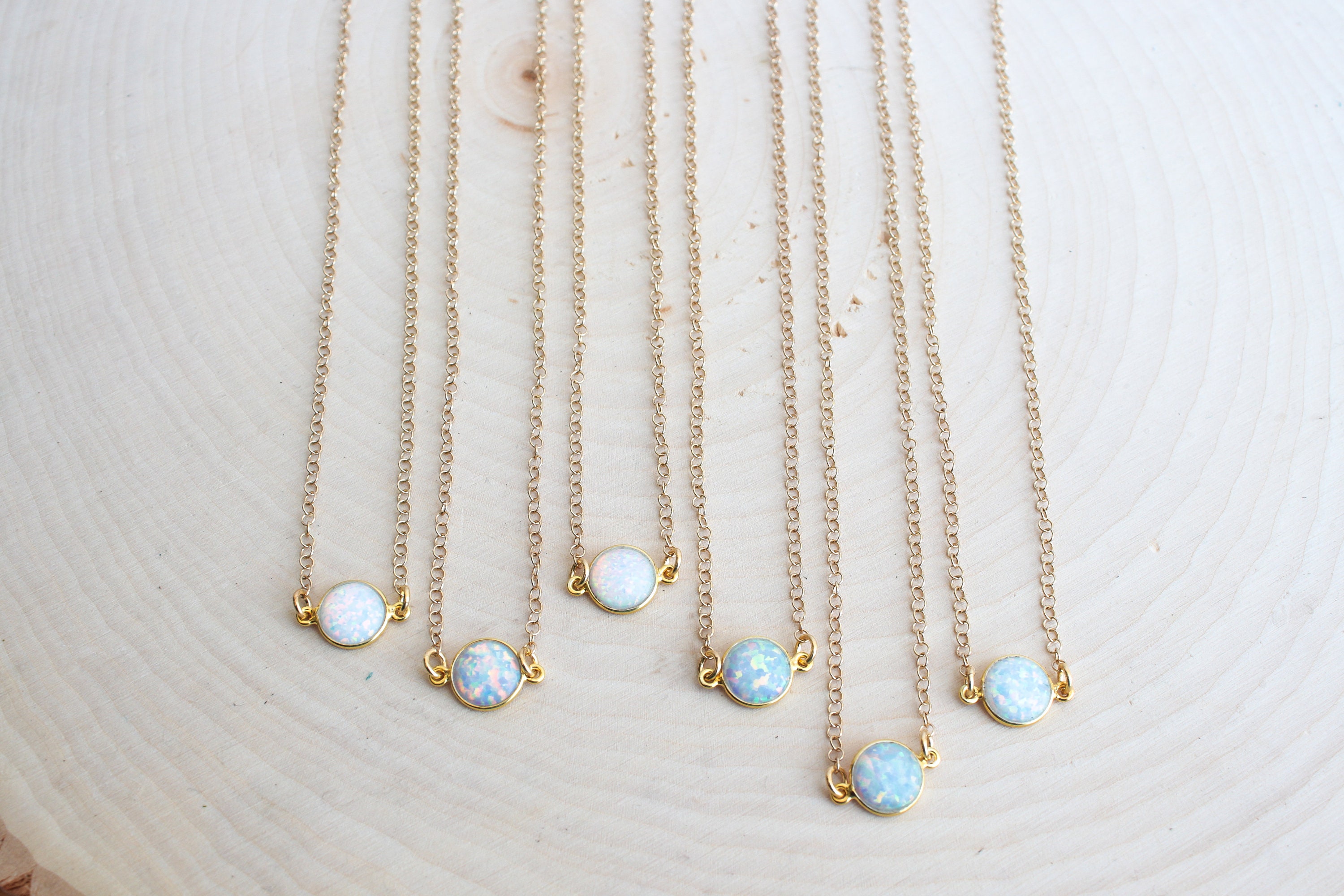 Man-made White Fire Opal links on gold plated brass chain. 8mm stone link, 16" long, 2" extension chain. Nickel Free