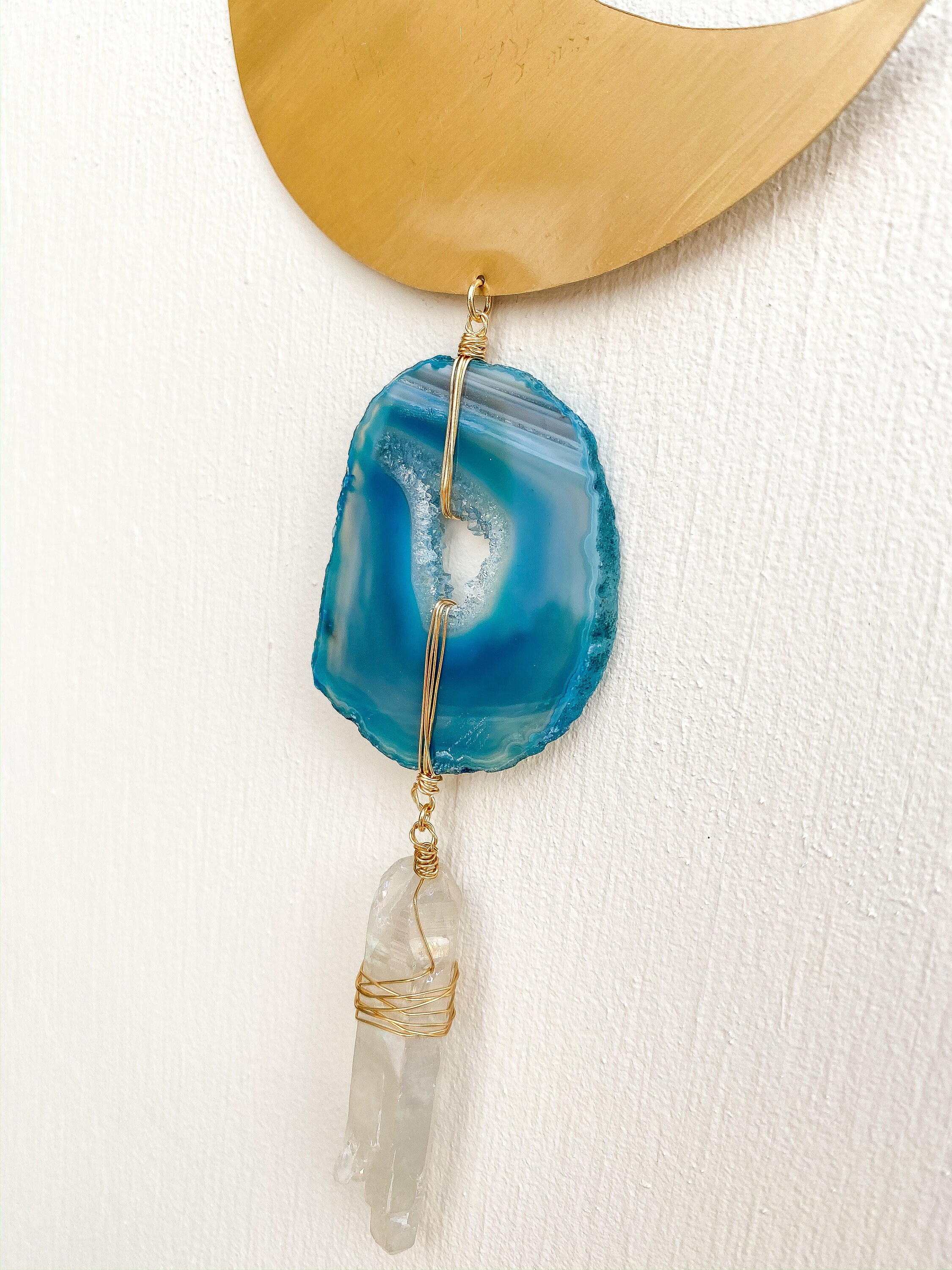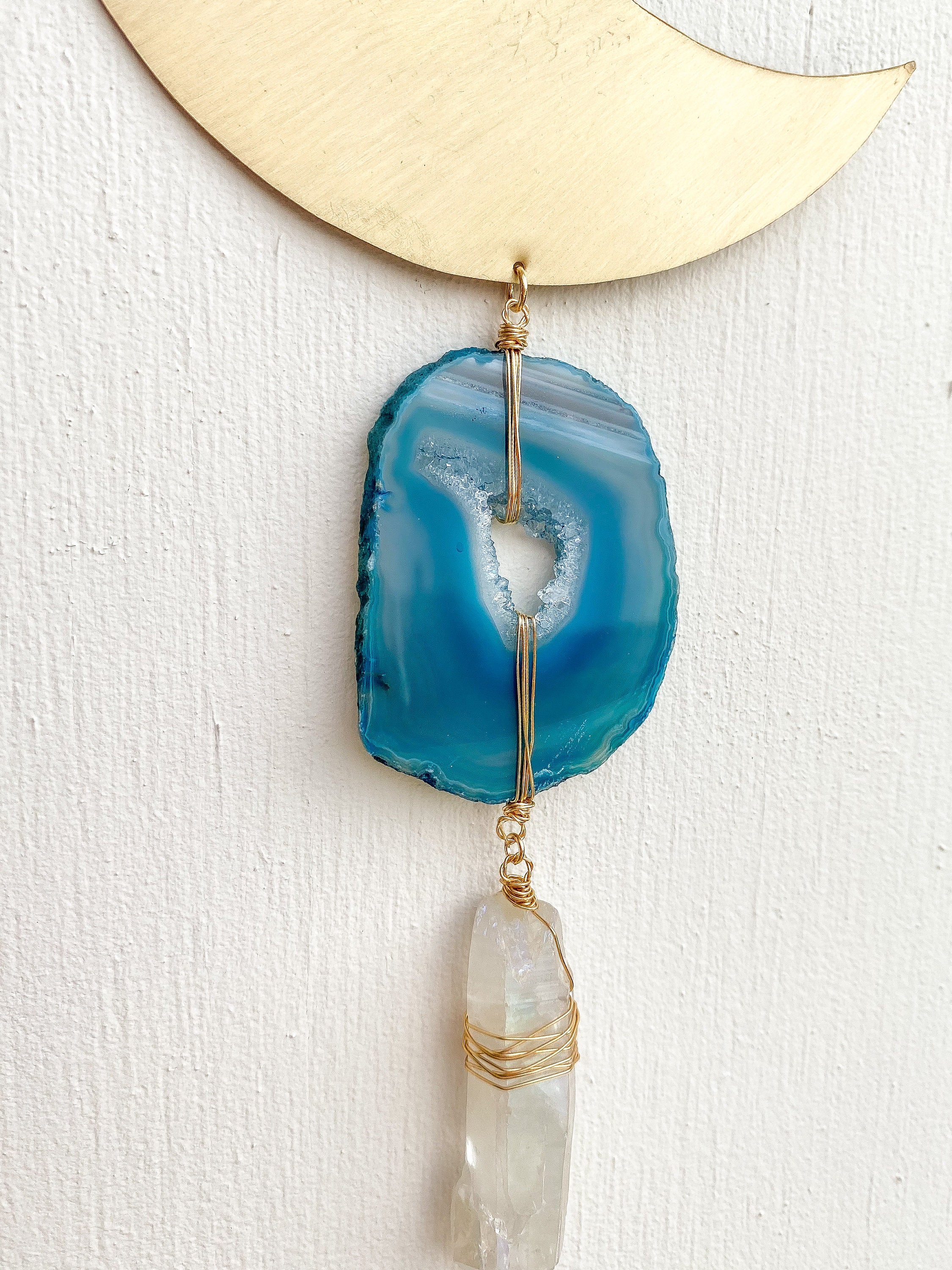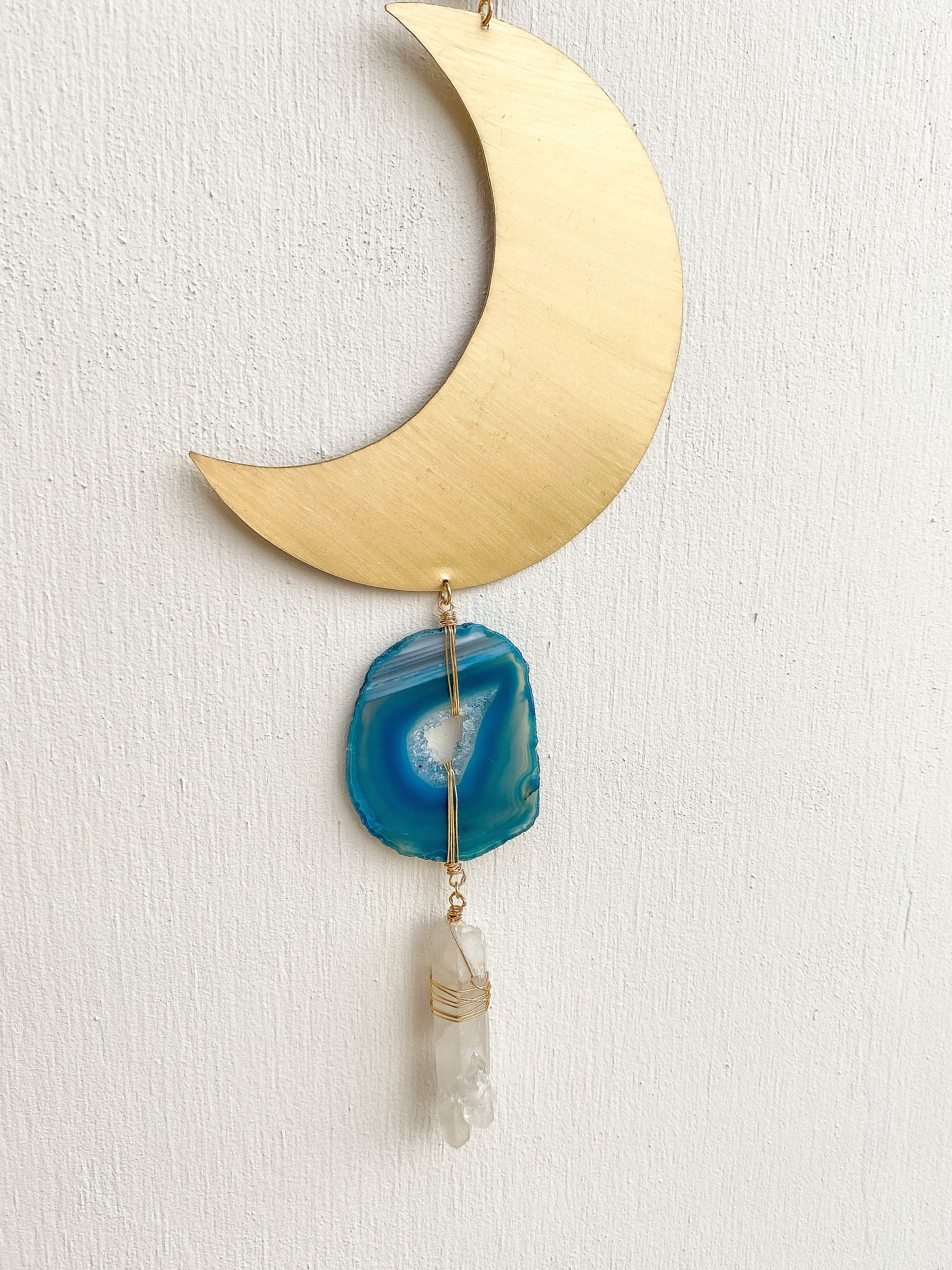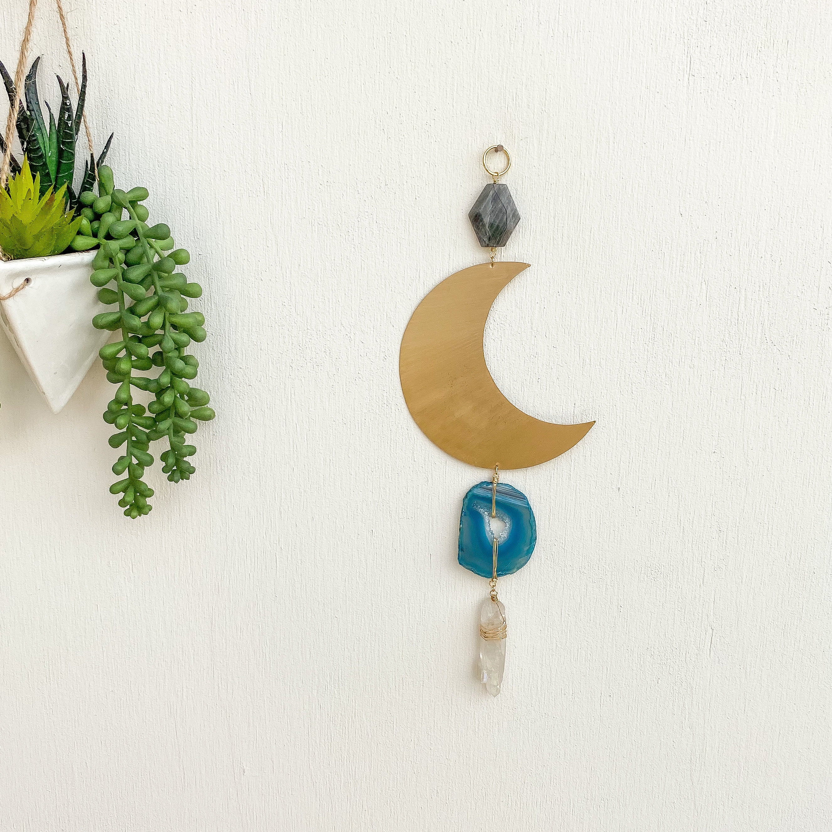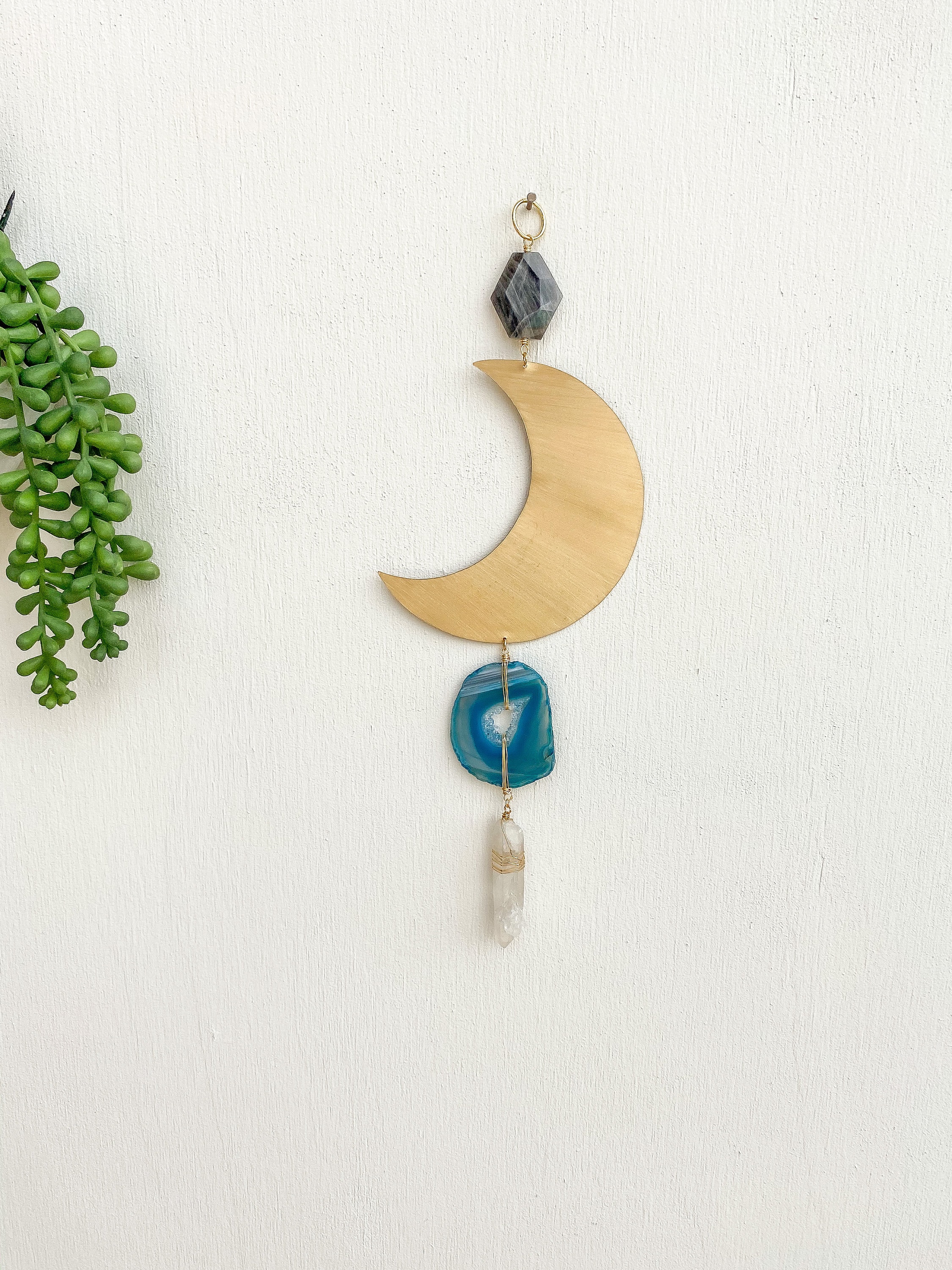 Hand-cut brass crescent moon wall hanging featuring natural stones: Labradorite, Agate & Quartz. Approximately 11 inches x 4 inches.
